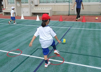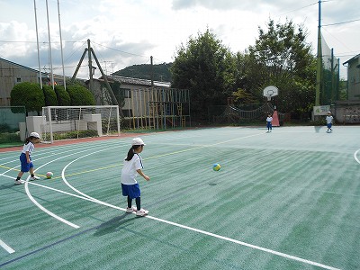 次に、お友達とペアになって、思いっきり蹴る練習をしました。 助走をつけて蹴ると、ボールはよく飛びますね。