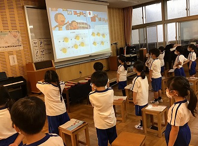 「♪ひのまる」のドレミ歌唱を学習しています。最後には、同じ音だけではなく、バラバラに音を隠して歌ってみました。
