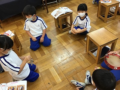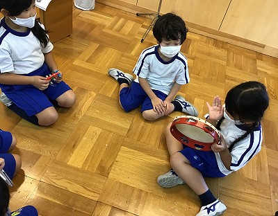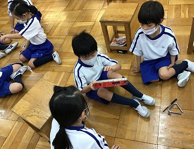 もう一つの学習は、“いい音見つけ”です。リズム楽器を手に、演奏の仕方を工夫しようというめあてです。