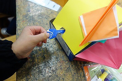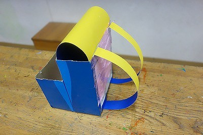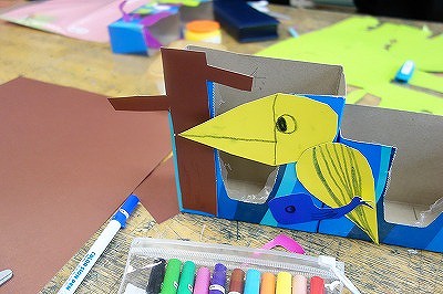 前回は、色厚紙や色紙を使って箱の色を変えることに夢中になっていた児童が多かったのですが、今日はいよいよ飾り付けや機能性に関するものをつくる活動が中心となったようです。