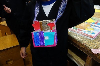 活動の終わりにはみんなで作品を鑑賞し合いました。「スズランテープでつくったリボンが本物のようでした。」「箱ともようの色がとてもきれいだとおもいました。」など、楽しく鑑賞した後に出た意見には、多くの友達が賛同していました。