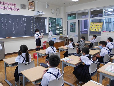 先週作った「生き物・動物クイズ」の発表会をしました。発表する人は、みんなに聞こえる声で、自分が考えたクイズを出題しています。