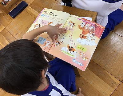 毛糸で遊ぶ様子、楽器を持って仲良く奏でる様子…いろいろなねこちゃん達の絵が、教科書一面に描かれています。
