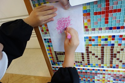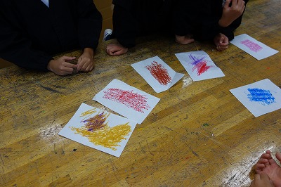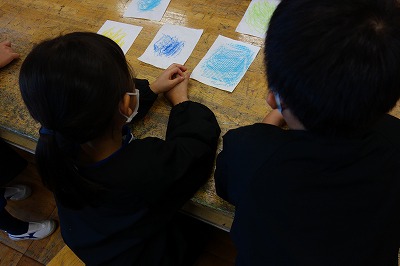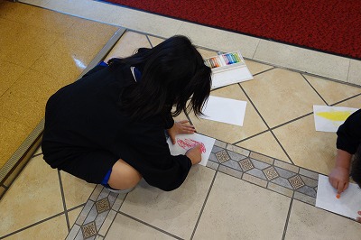午後からの図画工作は「でこぼこ はっけん!」の学習でした。これは身のまわりのでこぼこを探し、フロッタージュ(こすりだし)で生まれる形のおもしろさを味わう鑑賞の学習です。年度の始めに「造形室からこんにちは」でも、紹介した内容に似たものです。まずは、こすりだしの仕方を聞き、場所探しからスタートです。