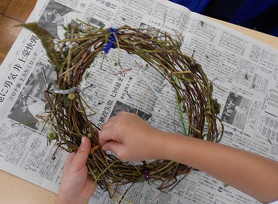 アサガオのつるを使って、リースを作りました。先週、植木鉢を片付けた際に、ほどいたつるを輪の形にしておいたものを整えるところからスタートしました。