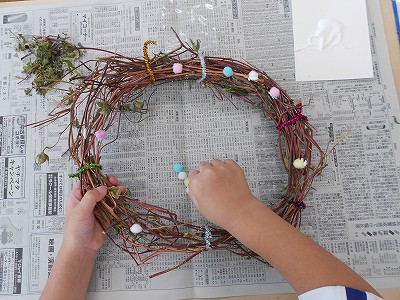 「お花の数調べ」や「色水遊び」「種取り」などにも意欲的に取り組み、多くの発見をするとともに、今日のリース作りまで楽しく学習を進めることができました。