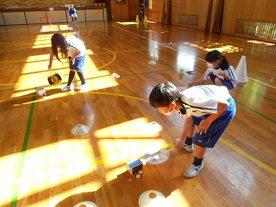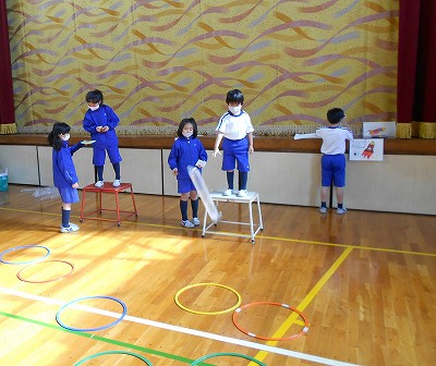 フラフープの位置は、遊びやすいように2年生が調整してくれました。