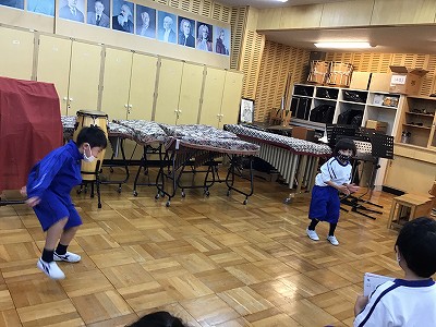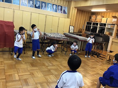 “ドンドン”や“リンリン”と、休符が入るところで楽器の音が聞こえてきます。そのお休みで、身体を使った“大きな音”“かわいい音”を表現する活動を行いました。