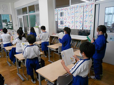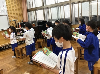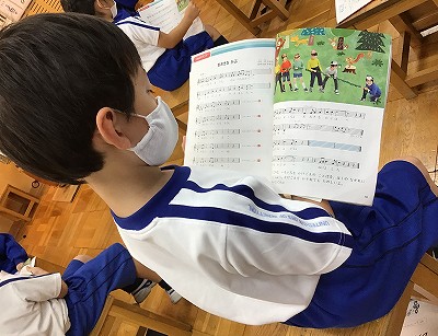 最後は、6つのチームで担当を決めて、役割が回ってきたら“立ち上がって歌う”の活動を行いました。チームの友達と声をかけ合い、「音楽げき・大きなかぶ」の流れを通して歌うことができました。