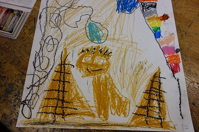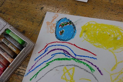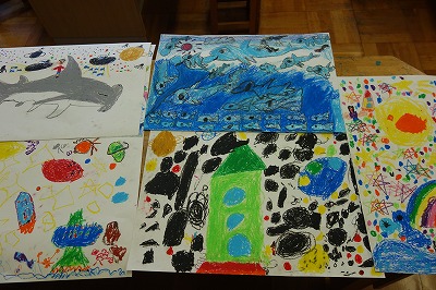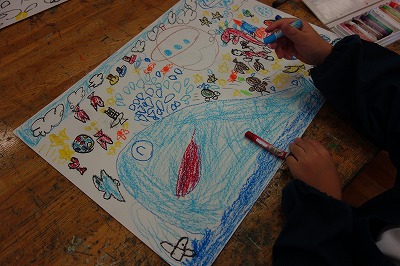 描き始めると描くスピードの速さに、改めて感心しました。描きたいものをどんどん思い付き、みるみる画面が埋まっていきます。児童が持つクレヨンの先から次々に生まれる形や色からは、児童本人の声が聞こえてきそうです。