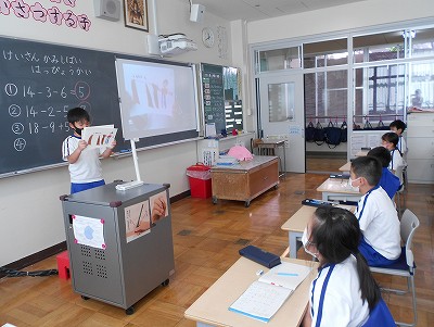 発表を聞いているみんなは、お友達が考えたお話を聞き、ノートに式と答えを書きました。