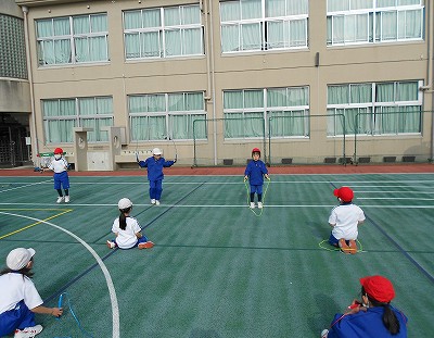 今日から、「なわとび」と「中あて」の学習に入りました。なわとびは、前回しとびが基本です。2学期は、とにかく回数を飛ぶ練習をしています。