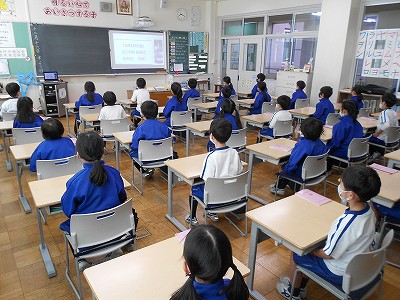 「校歌斉唱」で始まった音楽の時間。久しぶりの「校歌」です。「みんな、覚えていますか?」の投げかけに、「だいじょうぶです!」「聞いたら、思い出せると思います~」と、ほほえましい反応が届きました。