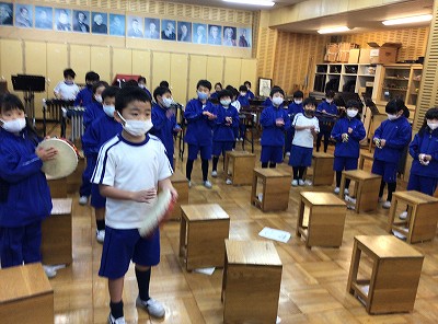 大変明るい声で歌唱した後は、“がっそう”です。今日は、リズム楽器も取り入れて“がっそうを楽しもう!”と、1年キッズに呼びかけました。