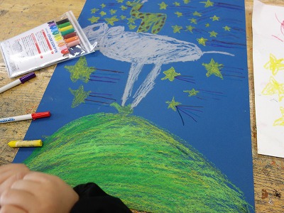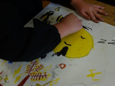 作品展では、自分の作品をみんなに見てもらえることで、また「やる気スイッチ」が入ったのか、時間が少しあることを伝えると、いったん終わった学習にもかかわらず、再び意欲的に描き足し始めました。