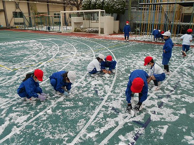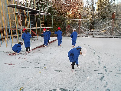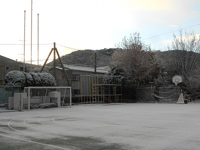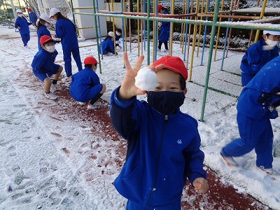 「うわぁ~、真っ白!」「外で遊べますか?」と、登校後の子ども達は、真っ白な運動場を見て、雪の話題で持ちきりでした。