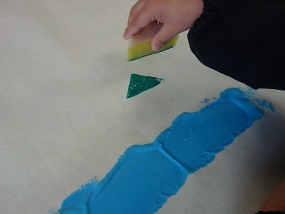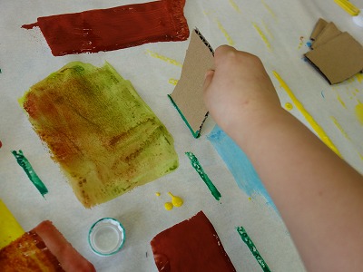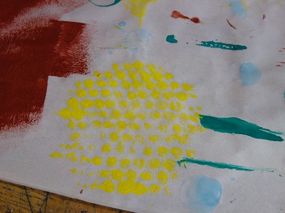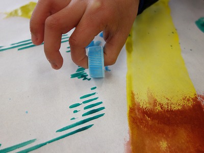 3学期最初の図画工作は、いろいろな材料の形をうつすことを楽しむ活動です。お皿に溶かれた絵の具にスポンジやせんたくバサミ、プチプチ(緩衝材)やダンボールの切り口などをつけて大きな紙に押します。