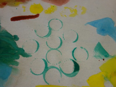 絵の具の量や押す時の力加減などで、生まれる形にも変化が出ます。また、スポンジローラーやペットボトルキャップの側面に絵の具をつけてコロコロすると、長い帯状の線が生まれます。