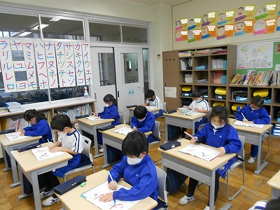 「はね」「止め」「はらい」「おれ」「まがり」「そり」に注目して、カタカナと漢字の復習をしました。また、「書き順」や「4つのお部屋」にも気をつけて、濃く丁寧に書く練習をしています。
