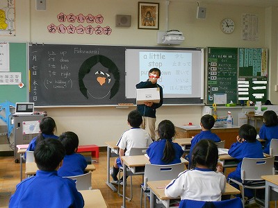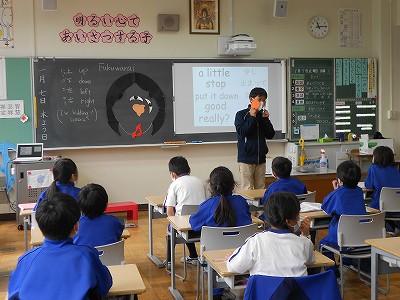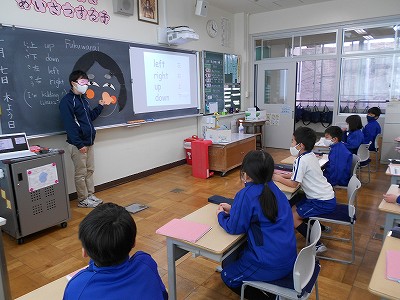 そこで、上下左右だけでは物足りないことに気づいた子ども達。"Put it down."「置いて!」などの言葉を入れながら、実際に1年生が前に出て楽しみました。