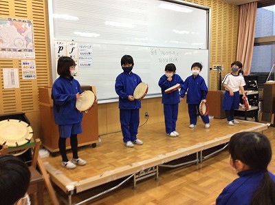 明るい声で「♪森のくまさん」の交互歌いを行った後は、「♪フルーツケーキ」の発表です。今日は、自分が考えたフルーツに“リズム打ち”を加えて“自分とみんな”の「まねっこあそび」を発表してもらいました。