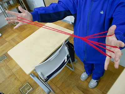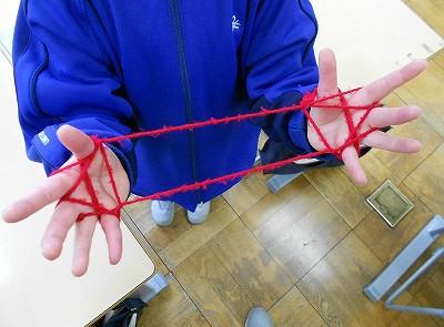 「今、1年生で大はやりの"あやとり"を、英語で [cat's cradle] と言うよ!」からスタートしました。