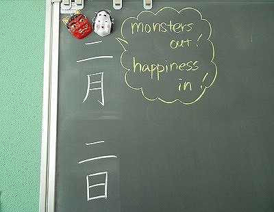 Today we celebrated Sestsubun here at school. Paul sensei played the character of the Demon and the students shouted “Monsters get out!” as they chased out the demons from their classroom. After they welcomed the “Angels” and invited the good luck to please come in!