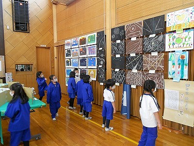 わくわくしながら体育館に行き、お兄さん・お姉さんたちの作品を鑑賞しています。