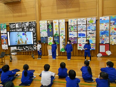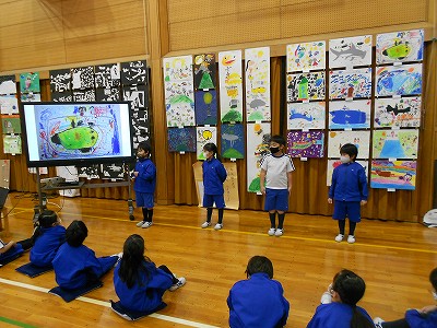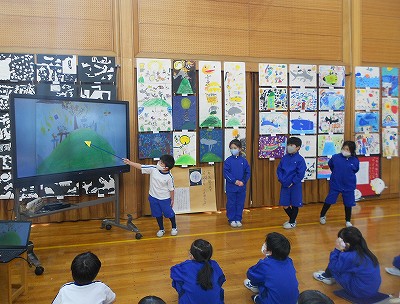 聞いているみんなは、とてもよい姿勢で、発表者の友達を応援しながら聞いていて、お友達の作品の工夫をたくさん見つけることができました。