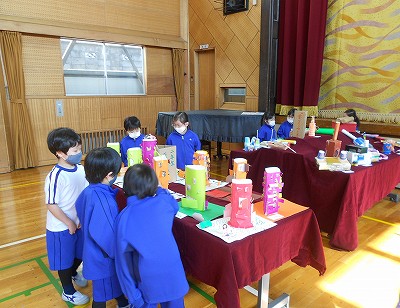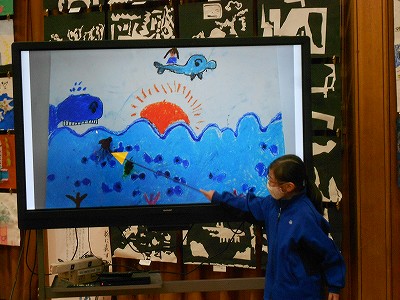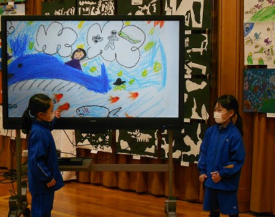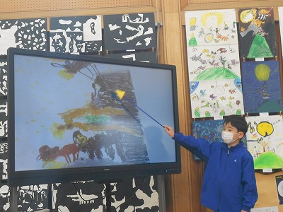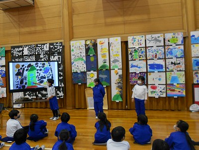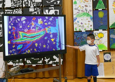 鑑賞会では、図工の作品について、作品が仕上がるまでの過程を振り返りながら、工夫したところやがんばったところを一人ずつみんなに語りました。