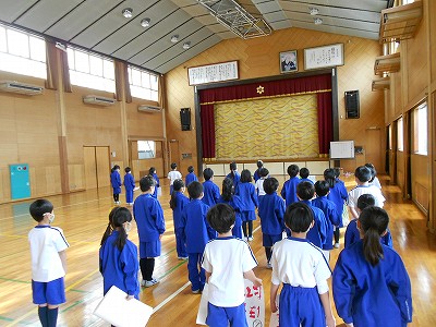 体育館へ行き、6年生の場所や、1年生のみんなの立つ場所などを確かめました。