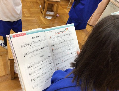 続いては、「♪音楽のおくりもの」も、最後まで通して歌う練習をしました。1番の終わり方と2番の終わり方が違うので、大変難しいのです。その点に注意して、CD伴奏に合わせて歌いました。