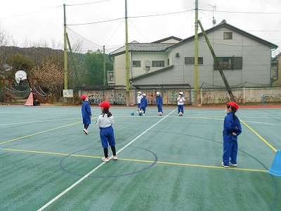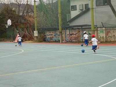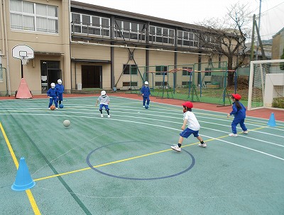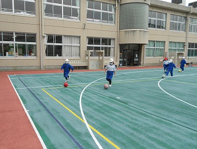 今日は「ボール蹴り」を中心に活動しました。まずは、グラウンド1周ドリブル。強く蹴りすぎないように、ボールに自分のスピードを合わせて走ります。