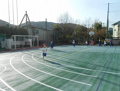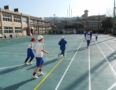 今日は中高のグラウンドが体育の準備中であったため、小学校グラウンドで行いました。