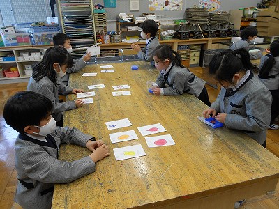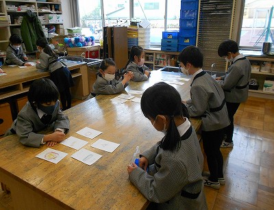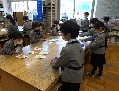 教室よりも広い造形室で、お店屋さん役とお客さん役に分かれて活動しました。
