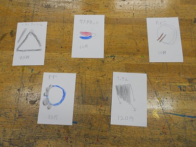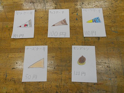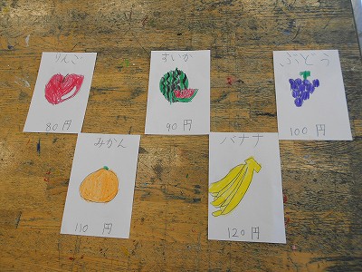2学期の国語で学習した「ものの名前」と、3学期の算数で学習した「お金の計算」の学習を発展させて、「お店屋さんごっこ」をしました。