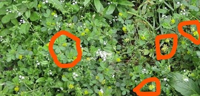 街路樹の根元に コメツブツメクサを みつけました。まるい葉に 黄色い花です。