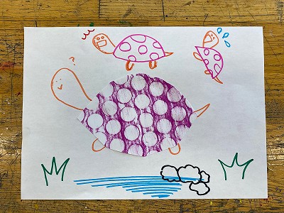 先生は,丸いもようからかめのこうらを思いついたので,かめをかいてみました。