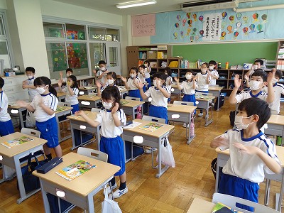 はじめに英語ビートのリズムに乗せて歌とダンスです。いきなりエンジン全開!
