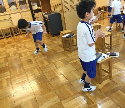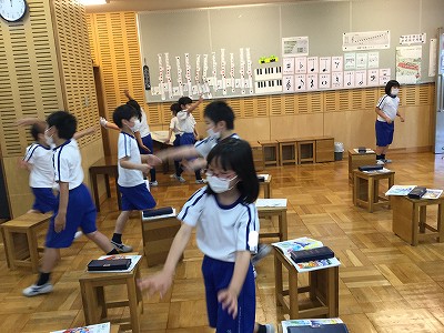 「♪朝のリズム」にのって、音楽のスタートです。