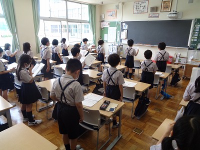 歌詞を覚えようと、教科書を見ながら歌っている2年生が、“ビュ~ン”のたびに、上に上がったり下に下りたりして、体の動きを入れて歌ってくれました。