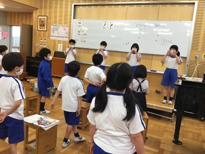 もうひとつは「♪ジェットコースター」という曲を歌唱しました。先ほどの「♪かくれんぼ」の雰囲気とは正反対の曲です。歌の途中に“ビュ~ン”というオノマトペが数回出てきます。とってもにぎやかな曲です。