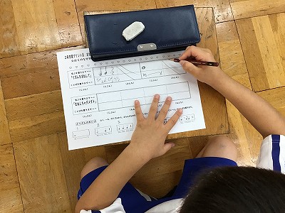 音符を書くことは学習済みなので、教科書のリズムパターンをもとにして、プリントに記入していきました。