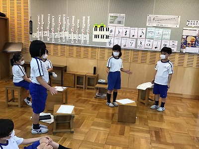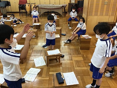 時間の終わりには、リズムをうまくつなげて、「リズムをまねして…」の発表をしました。