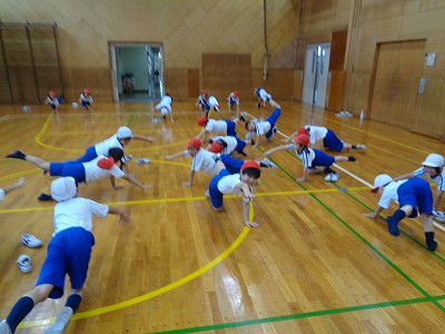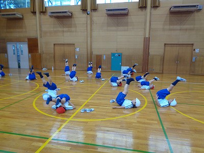 体育館でバランス運動やストレッチに取り組みました。