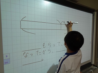 はじめの数やもらった数、ぜんぶの数などのキーワードを全体で確認し、テープ図に表しました。