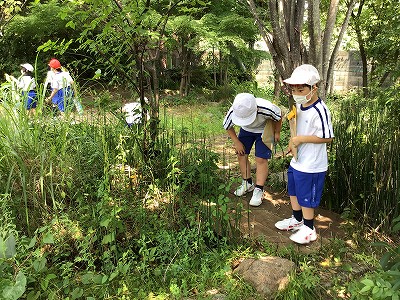 5校時は生活科です。先週は雨の日が続き、観察が出来ませんでした。久しぶりに花壇やビオトープの様子を観察にいくと、「ミニトマト・サツマイモ」「ビオトープの草木」が大きく成長しているのがよくわかりました。赤いミニトマトの数がグーンと増えています。