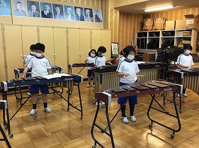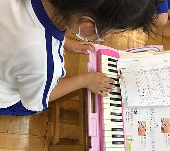手の消毒をして、順々に代わり合って練習をしました。順番を待つ間は、伴奏のパートやメロディのパートを“エアけんハモ”の練習をして過ごしました。