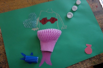 この児童はピンクの網目状の緩衝材で魚のウロコがひらめいたのですが,「せっかくきれいなピンクなのに魚にするのはもったいない」と思い,人魚になりました。
