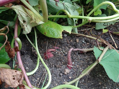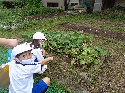 1校時の生活科は『サツマイモ』の観察と『ビオトープの生きもの見つけ』です。花壇のサツマイモは順調に育ち、サツマイモが少し顔を出していました。みんなで大きくておいしいサツマイモになりますようにと、願いを込めて観察しました。